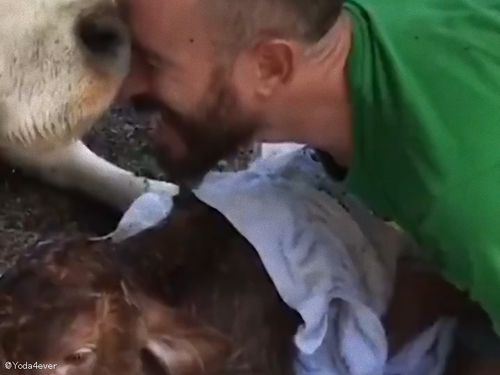 「ありがとう!」ママ牛が出産を手伝ってくれた男性に愛情を示す
